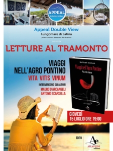 Continua la rassegna “Letture al tramonto” presso lo splendido scenario dello stabilimento “Appeal double view” di Latina, tra il lago e il mare in direzione Rio Martino, organizzata in collaborazione con la casa editrice Atlantide. Giovedì 15 luglio alle 19 il quarto appuntamento vedrà come protagonista il libro di Antonio Scarsella e Mauro D’Arcangeli “Viaggi nell’Agro Pontino. Vita, vitis, vinum”.