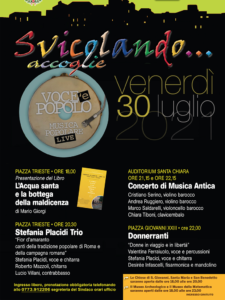 A partire dalle ore 18,00, l’idilliaca Piazza Trieste sarà la cornice della presentazione del libro “L’Acqua Santa e la bottega della maldicenza” del professor Mario Giorgi e a seguire, alle ore 20,30 del concerto “fior d’amaranto canti della tradizione popolare di Roma e della campagna romana”, di Stefania Placidi Trio con Stefania Placidi, Roberto Mazzoli e Lucio Villani .
