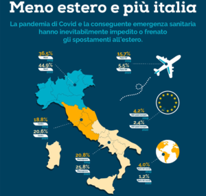 La pandemia di Covid e l’emergenza sanitaria hanno inevitabilmente impedito o frenato gli spostamenti all’estero. In un anno i viaggi fuori dai confini nazionali sono calati dal 23,2 al 9,1% del totale. Inoltre la necessità di ridurre i contatti sociali ha portato a un maggior ricorso per i viaggi ai mezzi propri a discapito dei mezzi collettivi, con gli spostamenti in auto sono cresciuti dal 56,5 al 73,9% del totale e quelli in aereo dimezzati dal 21,6 al 10,3%.