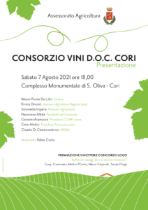 Sabato 7 agosto, presso il complesso monumentale S. Oliva di Cori, a partire dalle ore 18, verrà presentato il Consorzio Vini D.O.C. Cori, a cui seguirà la premiazione del vincitore del concorso indetto per la realizzazione e l’assegnazione del logo del Consorzio.