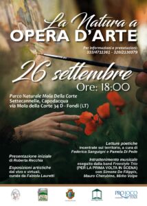 L’Associazione culturale Musicinecultura, con il patrocinio del Parco Naturale Regionale Monti Aurunci, del Comune di Fondi, della Casa della Cultura di Fondi e della Pro Loco di Fondi, promuove ed organizza l’evento “La natura a opera d’Arte”. L’iniziativa si terrà domenica 26 settembre 2021, dalle ore 18:00, presso il Parco Naturale Mola della Corte-Settecannelle-Capodacqua a Fondi.