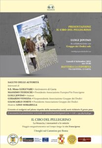 Lunedì 6 settembre alle ore 19:00 a Gaeta presso la Batteria La Favorita (via Faustina 26) sarà presentato il volume “Il cibo del pellegrino: la bisaccia, i monasteri e le osterie”, di Luigi Jovino, per GSE Edizioni. Alla presentazione del volume, oltre al saluto delle autorità, interverranno l’arcivescovo di Gaeta Luigi Vari, il presidente dell’Associazione Europea Vie Francigene Massimo Tedeschi, e poi Gerardo Venezia e Giancarlo Forte della presidenza dell’Associazione Gruppo dei Dodici odv che ha collaborato alla stesura del libro.