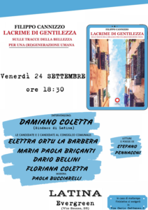Venerdì 24 Settembre, ore 18:30, a Latina, nella splendida cornice del parco Evergreen (in via Sezze, 25), si terrà la presentazione del libro del filosofo Filippo Cannizzo, “Lacrime di Gentilezza. Sulle tracce della bellezza per una (ri) generazione umana”, recentemente insignito del Premio Speciale del Bancarella.