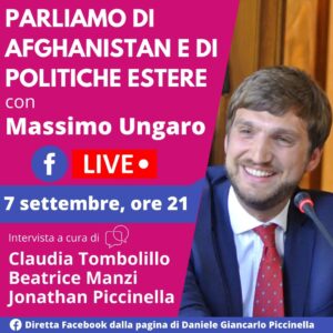 Questa sera alle ore 21, in diretta sulla pagina Facebook di Daniele Giancarlo Piccinella, interverrà il deputato Massimo Ungaro per discutere di Afghanistan e politiche estere, tematiche molto importanti in questo periodo.
