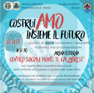 Giovani e politica, povertà e accoglienza, ambiente, cultura, digitalizzazione saranno tra i temi al centro del dibattito, che coinvolge fin da ora quanti vorranno partecipare. Infatti, tutti possono già oggi fare una domanda per i candidati a sindaco e inviarla via mail all’indirizzo acsantamariasezze@gmail.com. Le domande pervenute entro le ore 12.00 del 18/09/2021 saranno raccolte dagli organizzatori e proposte ai candidati durante l’incontro. «Invitiamo tutta la cittadinanza, chiamata il 3 e 4 ottobre prossimi a esprimere con il voto una preferenza importante per il futuro del paese, a partecipare all’evento, che speriamo sia per tutti un’occasione di ascolto, informazione e dialogo», concludono i giovani di Ac e Agesci.
