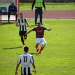 Si sgomita e si corre a testa bassa, mentre il tempo scorre lentamente. I rossoblù iniziano ad accusare una stanchezza più che giustificata e, così, gli ospiti ne approfittano e provano a riaprire una partita quasi barricata: al 37’ st Caruso gonfia il petto, autore di un’uscita sontuosa, a salvare un gol quasi certo; ma al 44’ st il capitano Criscuolo estrae dal cilindro una punizione esemplare, bucando il portierone rossoblù, che nulla può sul tiro estremamente preciso del numero dieci bianconero.