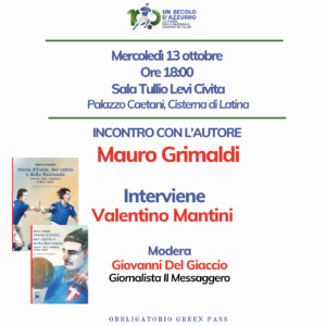 Parliamo di sport, di calcio e di Italia e anche di cultura, oggi, mercoledì 13 ottobre alle ore 18:00 presso la Sala Tullio Levi Civita all’interno di Palazzo Caetani a Cisterna di Latina. Con Mauro Grimaldi ci sarà anche il candidato sindaco Valentino Mantini. Modera l’incontro Giovanni Del Giaccio, giornalista de Il Messaggero.