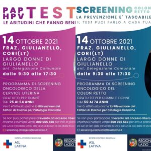 Inoltre, nella stessa giornata di giovedì 14 ottobre e negli stessi orari, sempre in largo Donne di Giulianello, si procederà allo screening oncologico del colon retto gratuito per uomini e donne dai 50 ai 74 anni.
