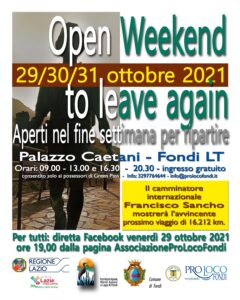 In occasione della conclusione della mostra fotografica: “Sette stagioni, uno zaino e tanta provvidenza” (19 settembre – 31 ottobre 2021), l’associazione Pro Loco Fondi propone la visione e il programma del nuovo cammino di ben 16.212 chilometri che il camminatore internazionale Francisco Sancho intraprende dal prossimo 13 novembre 2021.