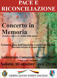 Continuano le iniziative organizzate in collaborazione tra i comuni di Fondi e Dachau nell’ambito del gemellaggio che dal 1998 vede le due cittadine impegnate insieme in eventi culturali, sportivi, sociali, artistici e culturali. Il prossimo appuntamento in programma è un concerto in memoria di tutti i caduti e le vittime della guerra intitolato “Pace e Riconciliazione”.