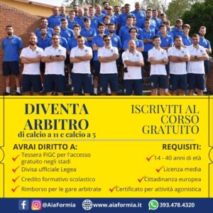 Prenderà il via lunedì 8 Novembre 2021 il corso gratuito per arbitri di calcio organizzato dall’Associazione Italiana Arbitri – Sezione di Formia. Le lezioni si svolgeranno in presenza all’interno del Centro di Preparazione Olimpica “Bruno Zauli” (Via Appia lato Napoli 175), dove l’associazione ha sede.