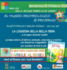 Un giorno al museo coi bambini, per scoprire le ricchezze del proprio territorio e sognare. Il Museo Archeologico di Priverno, in collaborazione con l’associazione culturale Sintagma, parteciperà alla Giornata Nazionale delle “Famiglie al Museo – F@MU 2021”. Domani presso l’Auditorium Santa Chiara in Piazza Santa Chiara nel centro storico di Priverno, alle ore 16:30, i bambini saranno i protagonisti di un laboratorio didattico dal titolo “Nulla accade prima di un sogno”. Si terrà l’incontro con l’archeologa e scrittrice Beatrice Cappelletti, autrice del libro illustrato “La leggenda delle Bella Ninfa”, edito da Sintagma, con la lettura ad alta voce e mostra delle tavole dipinte opera dell’artista Luciano Bracci. Seguirà un laboratorio di disegno per stimolare la creatività dei bambini che potranno trasformare la loro immaginazione in realtà, muniti di fogli, pennarelli e matite colorate.