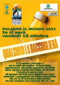 Venerdì mattina dalle ore 9 all’ingresso del Sentiero del Tempio sulla Strada Panoramica per il Tempio di Giove gli alunni della 5B classico del Liceo Statale “Leonardo da Vinci” di Terracina, coordinati dalla Prof.ssa Marta Minà parteciperanno alla campagna Puliamo il Mondo 2021, grazie alla sinergia tra l’Ente Parco Regionale dei Monti Ausoni e Lago di Fondi, il Circolo Legambiente Terracina Pisco Montano e lo storico Liceo di Terracina, da settembre guidato dal nuovo Dirigente Prof. Sergio Arizzi. https://www.parchilazio.it/montiausoni-schede-17527-puliamo_il_mondo_io_ci_saro_venerdi_15_ottobre_2021