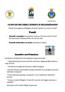 Dopo la mostra “Sette Stagioni, uno zaino e tanta provvidenza”, già sostenuta e fortemente voluta dall’Ente Parco con la collaborazione con la Pro Loco di Fondi, la città si prepara ad accogliere il pellegrino Francisco Sancho con una serata speciale in programma oggi, a partire dalle 18:00, a Palazzo Caetani.