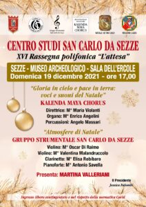 Domenica 19 dicembre, si terrà la XVI rassegna polifonica “L’attesa” promossa dal Centro Studi “S.Carlo da Sezze”. Si esibiranno nello splendido scenario del Museo Archeologico, con inizio alle ore 17:00, il Coro Kalenda Maya Chorus di Priverno nato nel 2015 che spazia dalla musica medievale a quella moderna e contemporanea, sacra e profana, sia a Cappella che con accompagnamento strumentale. Svolge un’intensa attività concertistica, invitato da enti ed associazioni, dal 2017 sotto la direzione artistica del M°Maria Violanti, organizza importanti rassegne musicali; ed il gruppo strumentale S.Carlo da Sezze nato da una intuizione del M° Giuseppe Di Prospero, che nel 2002 entrò nell’associazione del Centro Studi. Il M° Giuseppe Di Prospero, con la sua appassionata e ferma volontà di valorizzare i giovani musicisti setini, fondò il gruppo strumentale che negli anni è stata intensa l’attività concertistica e che oggi dopo la pandemia riprende con rinnovato ed appasionato impegno con la partecipazione dei Maestri Oscar Di Raimo, Valentina Malandruccolo, Elisa Robibaro ed Antonio Savella. “Con il Natale – dichiara la Presidente Jessica Palombi– viviamo la gioia della speranza, in questi momenti così difficili saremmo lieti che questa manifestazione possa far vivere un momento seppur breve di serenità e spensieratezza per tutti. Il Centro Studi San Carlo da Sezze rivolge a tutti gli auguri più sinceri di un sereno e Santo Natale”. Lo spirito resta quello che da sempre anima le proposte del Centro Studi, nel segno di una costante attenzione alla qualità ed alla fruibilità di un fare cultura – potremmo dire – sostenibile, in una attenta miscela di musiche di raro ascolto e brani (e autori) che strizzano l’occhio alla tradizione. La cittadinanza è invitata a partecipare, l’ingresso è libero.