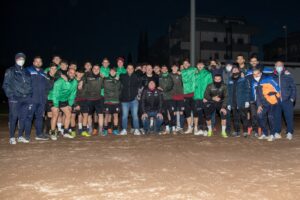 Dopo il saluto e uno scambio di battute con Andrea Bellamio e il suo staff, Di Donato ha posato insieme a tutto il gruppo squadra con la promessa di rivedersi presto in un campo di calcio.