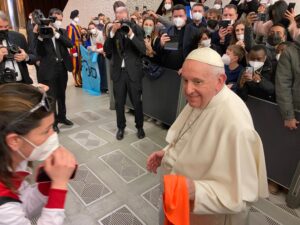 Inoltre, nell’intenzione di preghiera del mese di febbraio 2021, trasmessa nel video pubblicato dalla Rete Mondiale di Preghiera del Papa, aveva affermato: «Oggi continuano a esserci donne che subiscono violenza. Violenza psicologica, violenza verbale, violenza fisica, violenza sessuale. È impressionante il numero di donne colpite, offese, violate. Le varie forme di maltrattamento che subiscono molte donne sono una vigliaccheria e un degrado per tutta l’umanità. Per gli uomini e per tutta l’umanità. Le testimonianze delle vittime che hanno il coraggio di rompere il silenzio sono un grido di richiesta di aiuto che non possiamo ignorare. Non possiamo guardare dall’altra parte. Preghiamo per le donne vittime di violenza, perché vengano protette dalla società e perché le loro sofferenze siano prese in considerazione e ascoltate da tutti». Un grido di richiesta di aiuto che non si può ignorare e che non deve lasciarci indifferenti. Il gruppo, composto da una rappresentativa di Diritto&Donna e della squadra femminile della Laundromat Gaeta Futsal, è riuscito anche a incontrare il Papa, nel corso del consueto giro di saluto dei settori effettuato al termine dell’Udienza, e a consegnare direttamente nelle sue mani una maglietta da gioco, creata appositamente per lui.