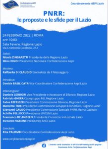 “PNRR, le proposte e le sfide per il Lazio” è il tema dell’appuntamento in programma oggi, giovedì 24 febbraio, a Roma, nella sede della Regione organizzato dalla Confederazione AEPI- Associazioni Europee di Professionisti e Imprese. Istituzioni, enti locali e mondo economico a confronto su progettualità e interventi. Transizione ecologica e digitale, efficientamento energetico, made in Lazio e incentivi: questi alcuni degli argomenti che saranno affrontati dai principali interlocutori che, concretamente, saranno impegnati nel Piano Nazionale di Ripresa e Resilienza.