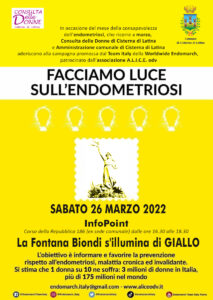 “L’amministrazione comunale – spiega l’assessore alle Pari Opportunità e Differenza di Genere, Maria Innamorato – aderisce alla campagna nazionale “Facciamo luce sull’endometriosi”, e sabato illuminerà con luci color giallo la Fontana Biondi, a testimoniare l’attenzione verso la tematica e l’impegno nella promozione della consapevolezza”.