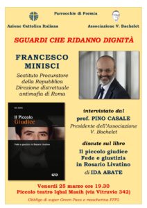 Venerdì 25 marzo alle ore 19.30 presso il Piccolo Teatro Iqbal Masih di Formia (Via Vitruvio 342) gli adulti dell’Azione Cattolica della città, in collaborazione con l’Associazione “Vittorio Bachelet”, ospiteranno il dottor Francesco Minisci, Sostituto procuratore della Repubblica presso la Direzione distrettuale Antimafia di Roma.