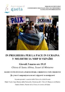La forania di Formia si riunirà domenica 6 marzo alle ore 17.00 presso la chiesa di Santa Teresa d’Avila a Formia per pregare insieme con la comunità ucraina di Formia, rappresentata da don Sviatoslav Tytuliak, dell’esarcato apostolico dei fedeli cattolici ucraini.