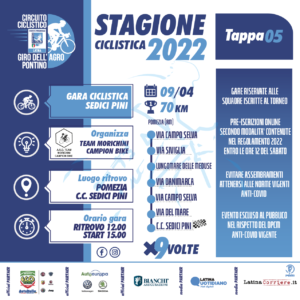 Si svolgerà sabato 9 aprile la quinta tappa del Giro dell’Agro Pontino Opes. L’evento denominato “Gara Ciclistica Sedici Pini”, si terrà a Pomezia, sotto la guida del Team Morichini Campion Bike.