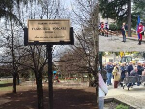 Il giardino pubblico di piazza Signina d’ora in poi porterà il nome di Francesco Porcari, il compianto pittore corese venuto a mancare il 18 novembre 2017. La cerimonia d’intitolazione si è svolta nella giornata di domenica 3 aprile, alla presenza della famiglia. Dopo l’esibizione degli Sbandieratori delle Contrade, sono intervenuti, oltre al sindaco di Cori Mauro De Lillis, il professor Domenico Palombi (università La Sapienza di Roma), gli ex sindaci Tommaso Conti e Pietro Vitelli, che ne hanno ricordato la statura di uomo e di artista. A loro si sono aggiunte le voci dell’amico Attilio Moriconi e di Massimo Ferrari, regista del documentario “Francesco Porcari il Pittore di tutti”, realizzato ad un anno dalla morte, in cui l’artista si racconta e racconta i suoi quadri, in cui affiorano le testimonianze di chi ha lavorato con lui, dei suoi amici, dei suoi familiari e in cui emerge la sua poetica, il suo legame con Cori, con la natura, con la famiglia, così come il suo rapporto con importanti esponenti dell’arte italiana e internazionale.