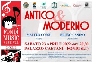 Sabato 23 aprile torna il Fondi Music Festival: il prossimo concerto, in programma alle 20:30 a Palazzo Caetani, sarà storico per la città in quanto vedrà esibirsi il violinista Matteo Cossu accompagnato al pianoforte dal Maestro Bruno Canino, tra i più famosi musicisti viventi.