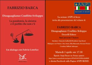 La sezione di Sezze dell’Associazione Nazionale Partigiani d’Italia organizza, per oggi, martedì 5 aprile 2022, alle ore 17.30, in modalità online sullo spazio Anpi Sezze della piattaforma Avaya spaces entrando attraverso questo link: https://spaces.avayacloud.com/…/5f7dc910475593b1a3a0fd28 e in diretta sulla Pagina Facebook Anpi Sezze, la presentazione del volume di Fabrizio Barca Disuguaglianze Conflitto Sviluppo. La pandemia, la sinistra e il partito che non c’è, Donzelli editore. Introdotto dal presidente dell’Anpi di Sezze, Giancarlo Loffarelli, l’incontro sarà coordinato da Raffaele Imbrogno. Dialogheranno con l’Autore, Sesa Amici, Elisa Raimondi, Giovanni Sorano e coloro che, fra i partecipanti, vorranno.