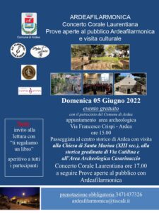 Proseguono gli appuntamenti di Archeojazz, a cominciare dalle ore 15.00 di Domenica 05 Giugno tornano le visite nel centro storico e all’interno dell’area archeologica “Casarinaccio” che terminano con un concerto, organizzate dall’Ardeafilarmonica. L’iniziativa culturale che vede il patrocinio del Comune di Ardea parte, con l’appuntamento alle ore 15.00, dal sito archeologico di “Casarinaccio”, in via Francesco Crispi, da lì tutti insieme si proseguirà per un’istruttiva passeggiata verso il centro storico con visita alla Chiesa di Santa Marina (XIII sec) e alla storica scalinata di via Catilina. Di ritorno al sito archeologico dell’Area in via Francesco Crispi verso le ore 17.00, il pomeriggio proseguirà con il Concerto della Corale Laurentiana, 25 coristi che eseguono Spirituals, Canti popolari oltre che musica Polifonica. Al termine del concerto, prende il via una nuova iniziativa di Ardeafilarmonica, si potrà assistere alle “Prove aperte al pubblico”, saranno svelati i segreti di una esibizione, come nasce e come si compone un brano musicale, la scelta degli strumenti impiegati e altre rarità.