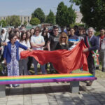 È stato il momento finale di un progetto che l’amministrazione comunale ha avviato circa due mesi fa all’interno dei due plessi di istruzione superiore del Campus dei Licei Ramaduù e che ha visto coinvolti gli studenti nel ridipingere due panchine con i colori della bandiera che simboleggia le battaglie per i diritti della comunità LGBT (sigla che significa lesbiche, gay, bisessuali e transessuali), una di fronte alla scuola, l’altra nella centralissima piazza della città, e cinque incontri di laboratorio per una performance musico-teatrale.