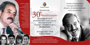 A moderare l’evento sarà il giornalista nonché presidente della Pro Loco Fondi Gaetano Orticelli. In platea saranno presenti amministratori, forze dell’ordine di ogni ordine e grado e una delegazione di studenti di tutte le scuole superiori della città, in particolare le classi prossime alla maturità che stanno affrontando le tematiche in oggetto in maniera trasversale e multidisciplinare. Diversi, infatti, i filoni di studio e di lavoro sviluppati dai diversi istituti: dalla storia al diritto, dall’attualità che suggerisce le tracce di saggi e temi, agli autori contemporanei ispirati dalle drammatiche cronache di mafia. Focus della mattinata il libro “Cose di Cosa Nostra”, pubblicato nel 1991, pochi mesi prima della strage, che raccoglie delle interviste rilasciate da Giovanni Falcone alla giornalista francese Marcelle Padovani. Nel corso dell’incontro verranno inoltre brevemente esposti i dettagli del progetto che ha visto la classe 5^C del liceo scientifico delle scienze applicate “A. Pacinotti” partecipare a Palermo, in qualità di scuola rappresentativa del centro Italia, alle celebrazioni organizzate in occasione dei 40 anni dall’uccisione di Pio La Torre.