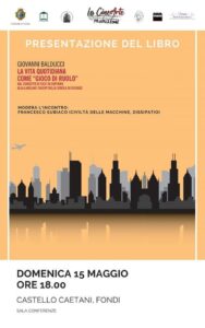 L’evento, promosso da “La cinearte produzioni” con il patrocinio del Comune di Fondi, è organizzato in collaborazione con l’accademia Internazionale Mauriziana, l’associazione culturale Musicinecultura, l’associazione FotograficheMenti e la Casa della Cultura. Media partner Radio Antenna Musica. Durante la presentazione, moderata da Francesco Subiaco (collaboratore delle testate “La civiltà delle macchine” e “Dissipatio”), interverranno l’autore Giovanni Balducci e Francesco Latilla, presidente dell’associazione promotrice, attore e autore sulle riviste di arte, musica e spettacolo “Il giornale OFF” e “Il Borghese”