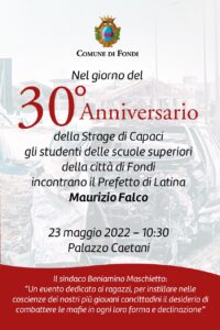 È dedicato a tutti gli studenti delle scuole superiori della città, allo scopo di informare, prevenire e sensibilizzare, l’evento organizzato dal Comune di Fondi in occasione del trentesimo anniversario della Strage di Capaci che ricorre lunedì 23 maggio.