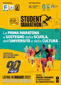 Sono già più di settecento gli studenti di ogni ordine e grado che si sono iscritti alla CSC STUDENT MARATHON, la mezza maratona dedicata agli studenti in programma sabato 14 Maggio alle 9.30 a Latina. Un evento che consentirà anche di donare materiale didattico alle scuole e all’università del nostro territorio. L’iniziativa promossa da “CSC – Città Sport Cultura”, ed organizzata dall’Asd IN CORSA LIBERA ed OPES Comitato Provinciale di Latina, patrocinata da Comune di Latina, Provincia di Latina, CONI Lazio e Regione Lazio, intende rafforzare il virtuoso connubio tra sport e cultura.