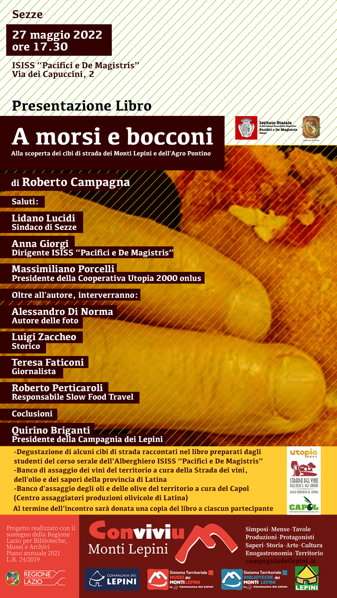 Il 27 maggio, alle 17,30, “A morsi e bocconi”, l’ultimo libro di Roberto Campagna, verrà presentato a Sezze, presso l’ISSIS “Pacifici e De Magistris”. Il libro è il frutto di una ricerca realizzata nell’ambito del progetto “Convivium” della Compagnia dei Lepini.