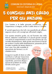 Con l’estate è arrivato anche il caldo afoso e l’umidità. Per aiutare tutti, ma soprattutto gli anziani, ad affrontarli meglio è stata realizzata una semplice guida, sia nel formato che nella lettura, contenente cinque piccoli-grandi consigli.