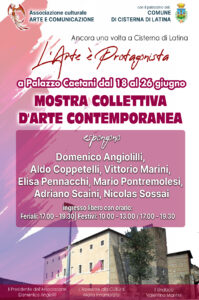 Domani alle ore 18, a Palazzo Caetani, nei locali espositivi della rocca Frangipane, si terrà l’inaugurazione della Mostra Collettiva di Arte Contemporanea organizzata dall’associazione Arte e Comunicazione con il patrocinio del Comune di Cisterna di Latina.