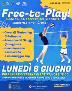 Open day di pallavolo al Palasport di Cisterna di Latina con la Top Volley. Lunedì 6 giugno a partire dalle ore 16, le porte del palazzetto si apriranno per il “Free to Play”, un’occasione per giocare sul parquet di via delle province che durante l’anno è stato calcato dai campioni delle squadre italiane del campionato di Superlega Credem Banca. L’iniziativa è aperta ai ragazzi e le ragazze nati/e nel 2002 e successivi. Verranno organizzati tanti campi all’interno della struttura, con allenatori e staff tecnico qualificati, assicurati divertimento e un omaggio griffato Top Volley Cisterna. Un’iniziativa creata per rafforzare ancor di più il legame tra la Top Volley e la città, tra i giovani che durante l’anno vivono il palazzetto di Cisterna per incitare i propri beniamini e tifare la squadra del cuore. Lunedì i ragazzi scenderanno dalle tribune per calcare il campo da gioco sotto la supervisione dei professionisti della Top Volley e della Marino Pallavolo che con il motto #insiemesiamopiùforti stanno costruendo un percorso condiviso che porterà tantissimi eventi a Cisterna e dintorni. Una giornata di svago, divertimento e sport da passare tutti insieme. “Free to Play” gode del patrocinio del comune di Cisterna di Latina e il servizio di assistenza e protezione sanitaria verrà garantito da Croce Rossa Italiana comitato di Latina, partner sociale della Top Volley. L’iniziativa è completamente gratuita e aperta a tutti! Vi aspettiamo! #CiVediamoAlPalazzetto.
