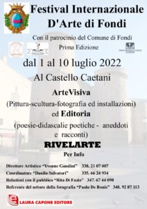 Pittura, scultura, installazioni, fotografia, didascalie poetiche e brevi racconti: sarà un tripudio di espressioni artistiche il primo Festival internazionale d’arte di Fondi RivelArte che si terrà al Castello dal 1° al 10 luglio. Il taglio del nastro è previsto alle 17:30 del prossimo venerdì quando, nel corso di una prestigiosa cerimonia, sarà presentato il progetto che ambisce a promuovere talenti artistici e ad attrarre in città amanti dell’arte in tutte le sue espressioni.