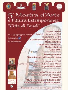 Nell’ambito della mostra d’arte e pittura estemporanea “Città di Fondi” 11 – 19 giugno 2022, l’Associazione “Ars et Vis”, in collaborazione con la Pro Loco Fondi, annuncia la conferenza interattiva del giornalista e scrittore Augusto Maria Micci (ex corrispondente al Parlamento Europeo e Consiglio d’Europa a Strasburgo).
