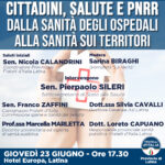 Il nuovo modello di sanità disegnato dal PNRR e le ripercussioni locali rispetto al sovraffollamento dell’ospedale Santa Maria Goretti di Latina saranno al centro del convegno organizzato dal coordinamento provinciale di Fratelli d’Italia Latina per giovedì 23 giugno alle 17.30 presso l’Hotel Europa di Latina. All’appuntamento dal titolo “Cittadini, salute e PNRR – Dalla sanità degli ospedali alla sanità sui territori”, moderato dalla giornalista Sarina Biraghi, interverranno il coordinatore provinciale sen. Nicola Calandrini, il sottosegretario alla Salute sen. Pierpaolo Sileri, il sen. Franco Zaffini, capogruppo di FdI nella Commissione Igiene e Sanità del Senato, il direttore generale della Asl dott.ssa Silvia Cavalli, l’esperta di sanità pubblica prof.ssa Marcella Marletta, e il dott. Loreto Capuano, responsabile provinciale sanità pubblica per FdI Latina.