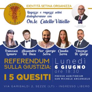 “Questo incontro – ha dichiarato il segretario di Identità Setina – si colloca all’interno di diverse iniziative che sta sviluppando il nostro partito per coinvolgere i cittadini anche su temi complessi come quelli trattati dal referendum sulla giustizia. Identità Setina vuole aprire dibattiti e discussioni per ascoltare posizioni e visioni diverse per permettere a tutti di avere gli strumenti necessari per fare una propria valutazione. La presenza sul palco di giovani preparati e con posizioni diverse insieme ad un giovane parlamentare italiano rappresenta la voglia di confronto continuo che ha il nostro partito”.