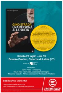 Sarà presentato per la prima volta a Cisterna di Latina, domani l’ultimo libro di Gino Strada dal titolo “Una persona alla volta”. La presentazione si terrà nella corte di Palazzo Caetani alle ore 19, all’interno del Cisterna Film Festival, con la partecipazione di Marco Rossi dell’Ufficio coordinamento volontari della sede di Roma, di Luca Ianiri coordinatore locale Emergency, i saluti istituzionali del sindaco Valentino Mantini e dell’assessore alla Cultura Maria Innamorato, le letture a cura dell’attrice Marianna Cozzuto di Mobilitazioni Artistiche; modererà l’incontro il giornalista Mauro Nasi di Sintagma.