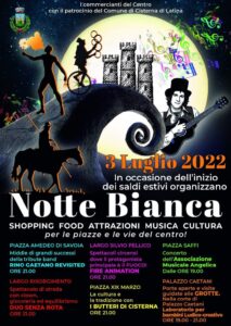 Sarà una lunga notte di spettacoli, musica, concerti, incontri, cultura, food e shopping quella organizzata per domenica prossima, 3 luglio, dai commercianti del Centro di Cisterna, con il patrocinio del Comune di Cisterna di Latina.