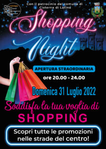 Le serate si fanno fitte di appuntamenti, occasioni di incontro e di acquisti questo fine settimana a Cisterna. Domenica il centro torna ad essere un centro commerciale all’aperto con “Shopping Night”, l’iniziativa promossa e organizzata dai commercianti in collaborazione con il Comune di Cisterna di Latina. Negozi aperti dalle 20 fino alle 24 con tante promozioni commerciali e proposte di animazione. Lo “Shopping Night”, peraltro, si unirà agli eventi in programma nelle due rassegne in corso organizzate dall’Amministrazione comunale, vale a dire “Cisterna Estate 2022” e “Sport in comune – Xsummer” in collaborazione con l’Osservatorio per lo sport e per il turismo sportivo.