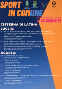 Da oggi, 15 luglio, al 27 agosto, il centro di Cisterna sarà lo scenario una kermesse di eventi sportivi dal rugby, al basket, alla boxe, al volley, al calcio, alla ginnastica artistica, al pattinaggio, alla danza, all’atletica leggera.