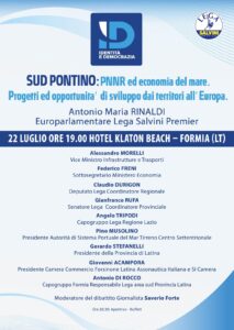 Saranno questi gli elementi comuni denominatori del convegno che, organizzato dal parlamentare europeo della Lega-Identità e democrazia”, il professor Antonio Maria Rinaldi, si svolgerà il 22 luglio, alle ore 19, presso l’Hotel “Klaton Beach” di Formia. “Sud Pontino: Pnrr ed economia del mare. Progetti ed opportunità di sviluppo dai territori all’Europa” è il titolo di un momento di confronto che intende sollecitare i territori a moltiplicare i propri sforzi, in tema di presentazione delle proprie istanze, per sostenere il rilancio dei diversi asset strategici facenti parte dell’universo della blue economy: la portualità commerciale e turistica, il traffico crocieristico, la cantieristica, la pesca, il diporto e la balneazione.