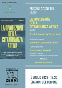Alle ore 18:30 di oggi, martedì 5 luglio 2022, presso i giardini del Comune di Latina, avrà luogo la presentazione del libro “La rivoluzione della cittadinanza attiva” ultima opera del professor Leonardo Becchetti. Il noto economista, da sempre studioso e divulgatore dei temi relativi all’economia civile e lo sviluppo sostenibile, torna a Latina dopo aver già presenziato nel 2019 quando la città veniva riconosciuta, a livello Nazionale, come esempio virtuoso di partecipazione e cittadinanza attiva grazie al modello dell’amministrazione condivisa.