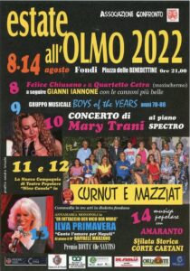 “Ben 28 anni consecutivi, senza interruzione neppure nel 2020 – commentano il sindaco di Fondi Beniamino Maschietto e l’assessore alla Cultura Vincenzo Carnevale – fanno dell’ “Estate all’Olmo” una delle manifestazioni più longeve della nostra città. E la nostra giunta è orgogliosa di patrocinare un evento che promuove le tradizioni, la cultura e i talenti locali oltre che la fondanità, dialetto compreso. L’invito, dunque, è a partecipare numerosi”.